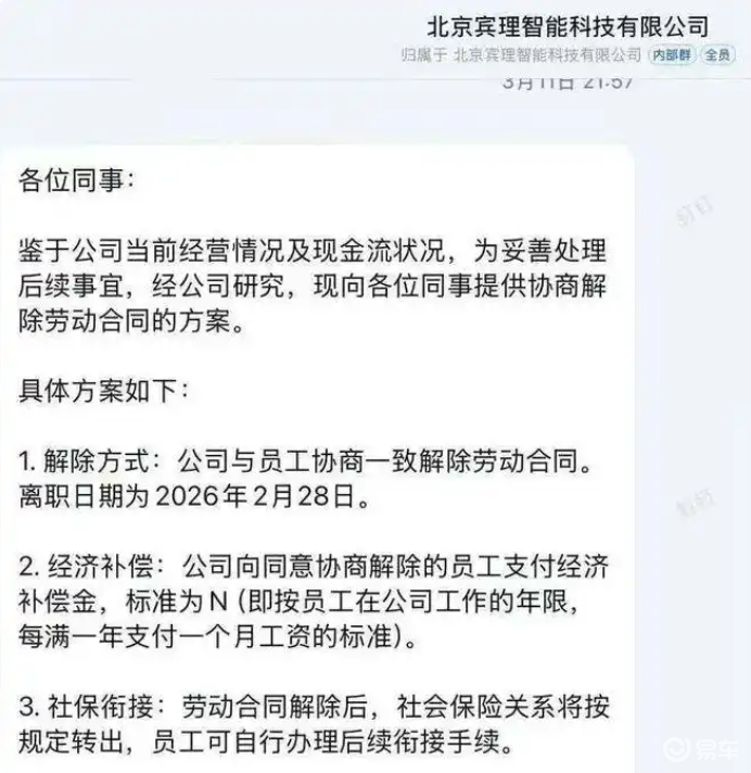 今年3月中旬,宾理汽车人力资源主管,在公司钉钉群中发布通知称,鉴于公司当前经营情况及现金流状况,决定与员工协商解除劳动合同。