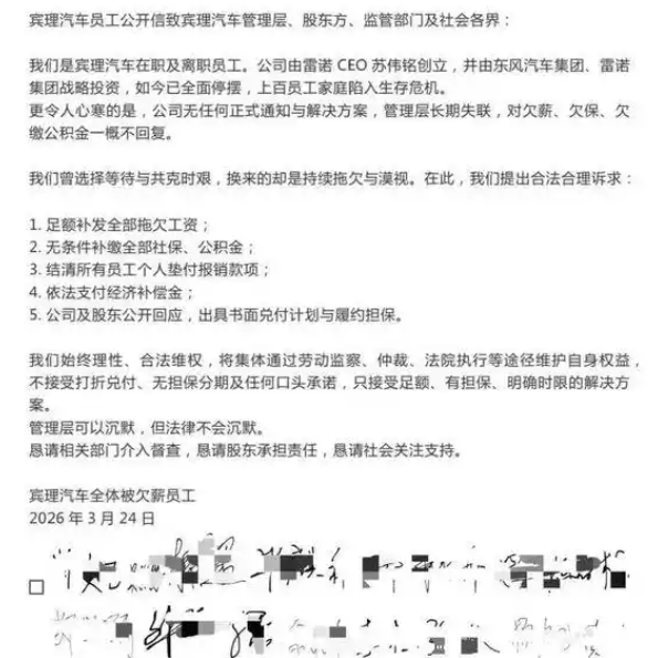 近日,宾理汽车员工联名公开信流传。信中称,公司已全面停摆,上百员工家庭陷入生存危机,管理层长期失联,对欠薪、欠保、欠缴公积金一概不回复。